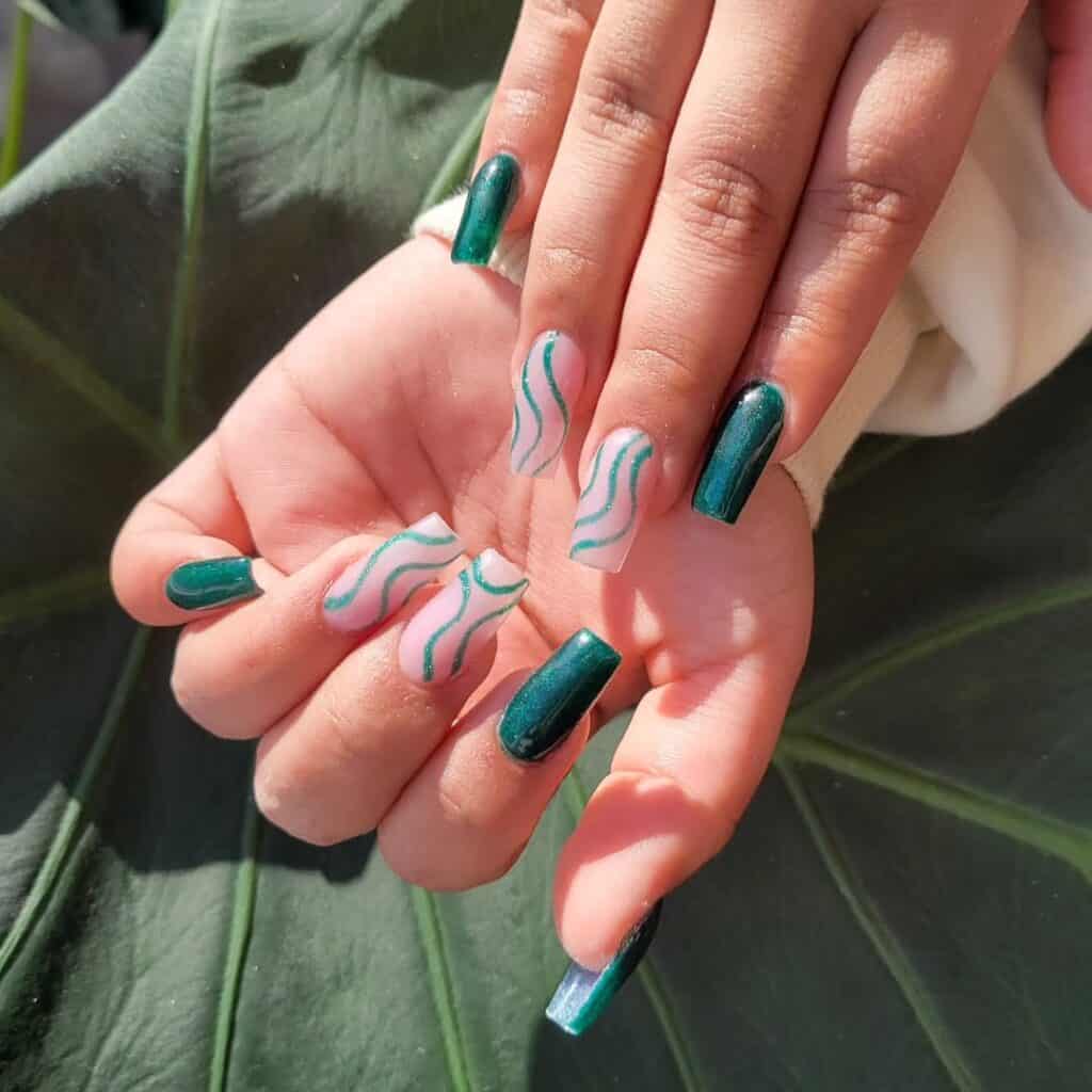 7 | Solid Green Glitter Square Nails & Pink Square French Nails With Green Glitter Swirls