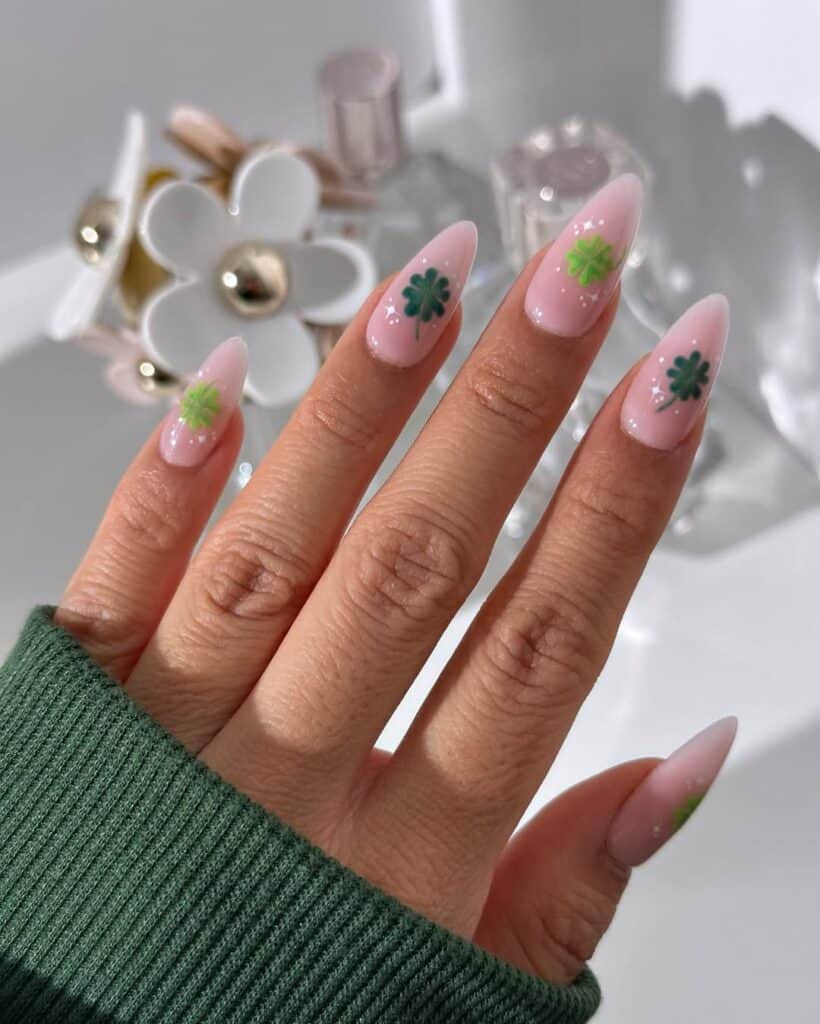 4 | Pink Almond Nails Accented With Green Four Leaf Clovers
