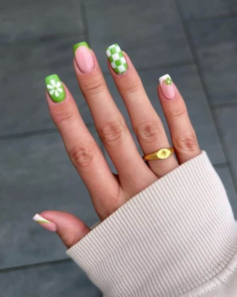 3 | Green & White Checkerboard & Daisy Nails