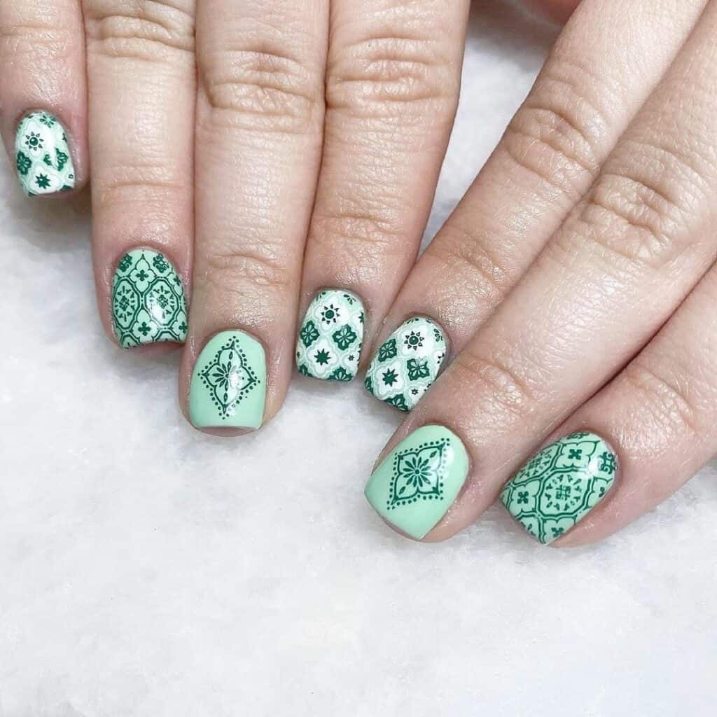 6 | Emerald Green Patterned Coffin Nails