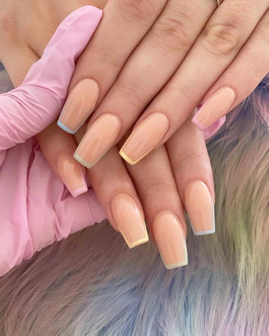 A soft and sleek take on the French manicure, these nude nails are paired with delicate pastel tips for a subtle yet classy look. The neutral base keeps the design sophisticated, while the pastel colors add a fresh and playful touch. Perfect for any occasion, this manicure blends minimalism with a hint of summer charm.