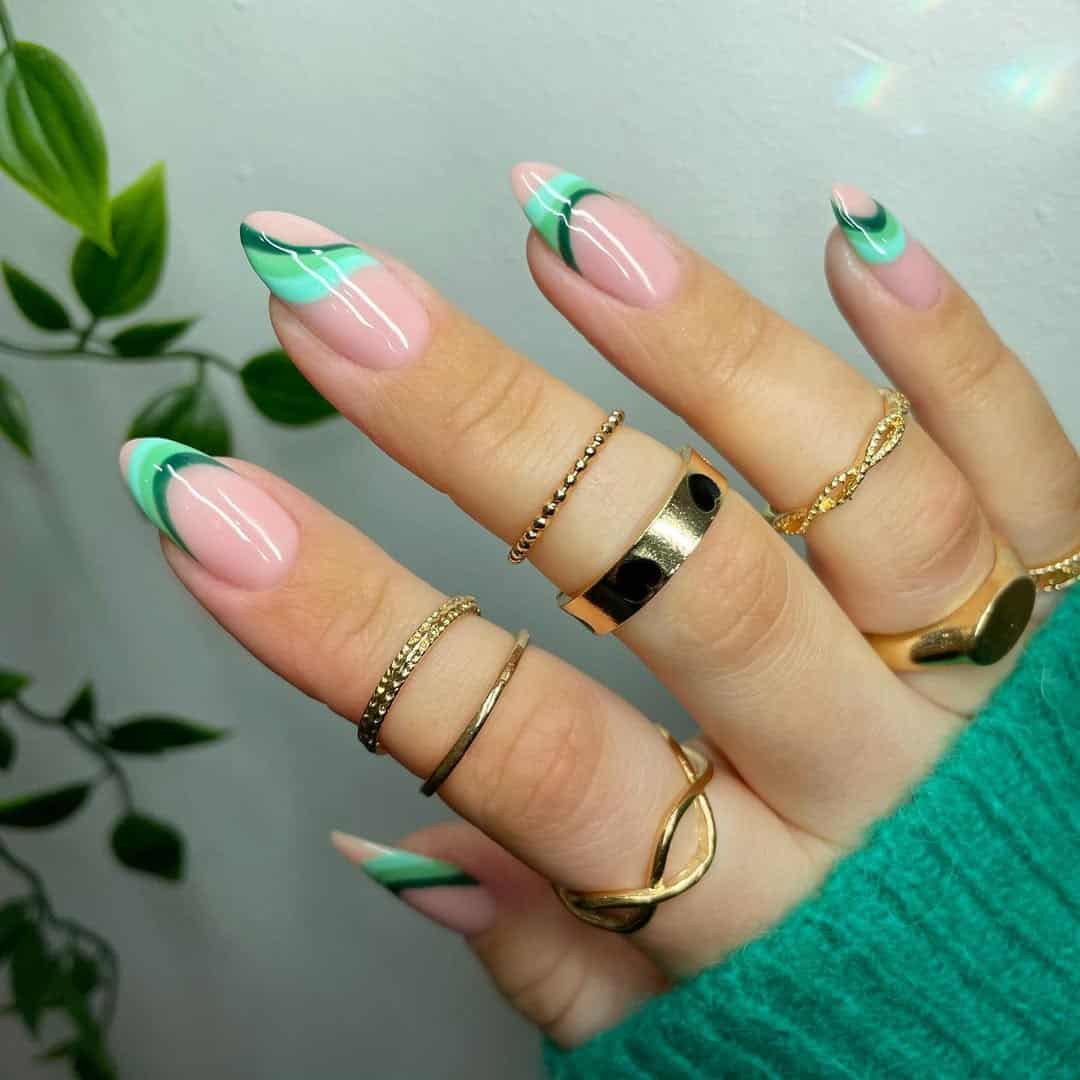These baby pink nails get a playful upgrade with vibrant green swirly tips, creating a fresh and eye catching contrast. The delicate pink base keeps the look soft and feminine, while the bold green accents add a modern twist. Perfect for summer, this manicure strikes the perfect balance between subtle and statement making.