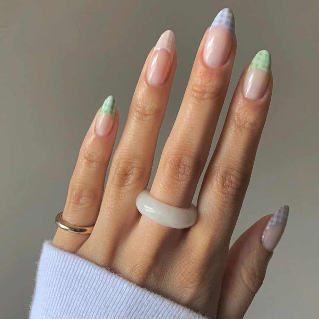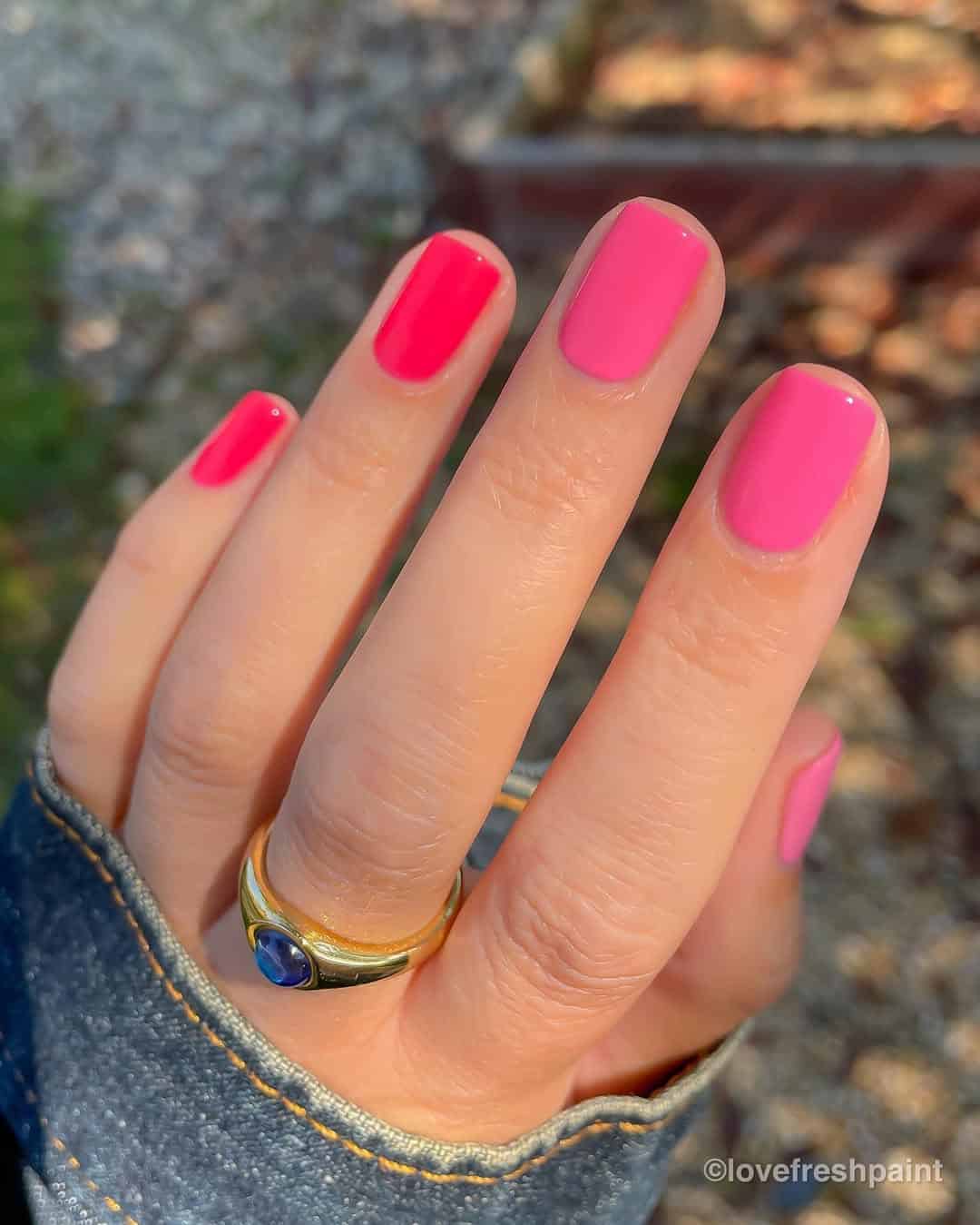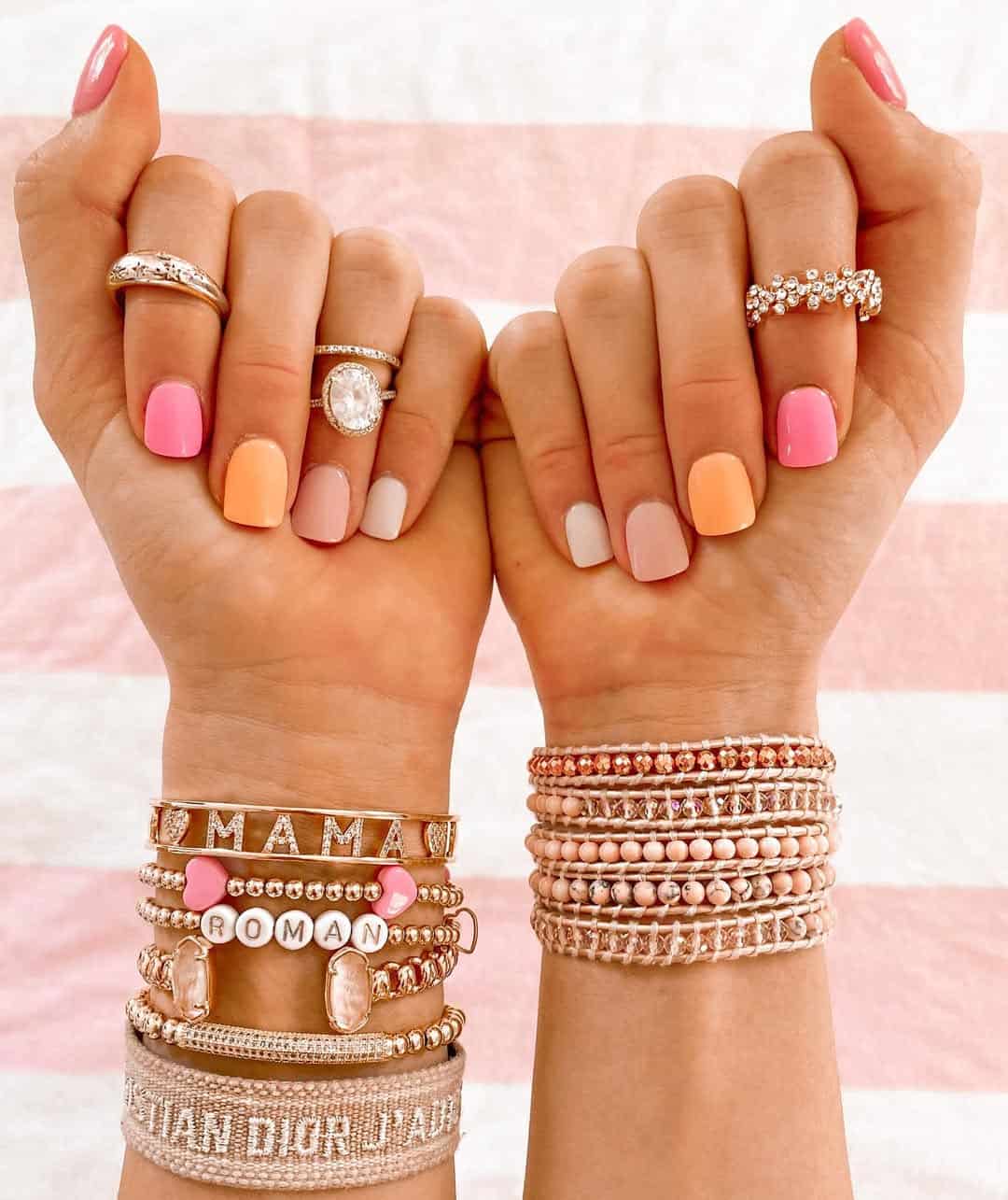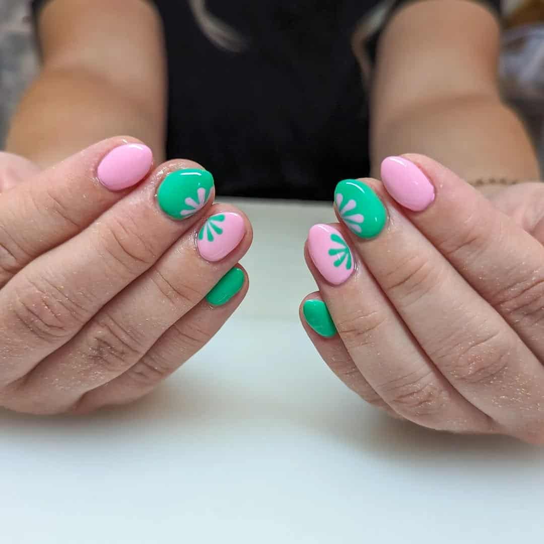A bright and playful combination, these short nails feature a bold mix of green and pink for a fresh summer statement. The solid colors keep the look simple yet striking, making them perfect for adding a pop of color to any outfit. Doesn’t matter if you prefer a soft pastel duo or a striking neon contrast, this manicure is fun and stylish.