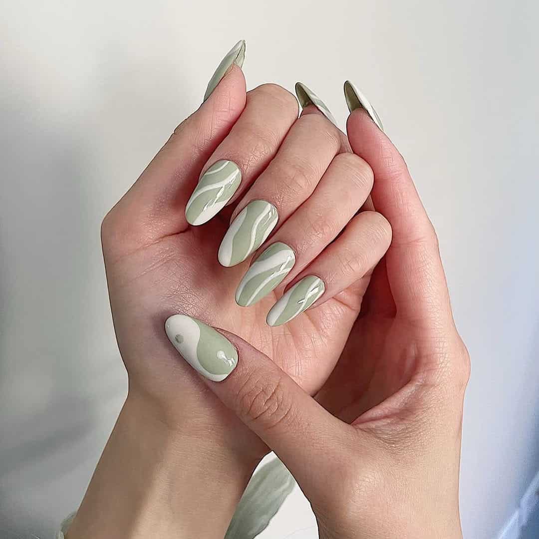 These beautiful almond shaped nails combine a soothing sage green with delicate cream swirls for a soft yet sophisticated look. The earthy tones evoke a natural, calming vibe, making them a fab choice for summer. Also, a great choice for dressing up or keeping it casual, this manicure adds a touch of understated elegance to any outfit.