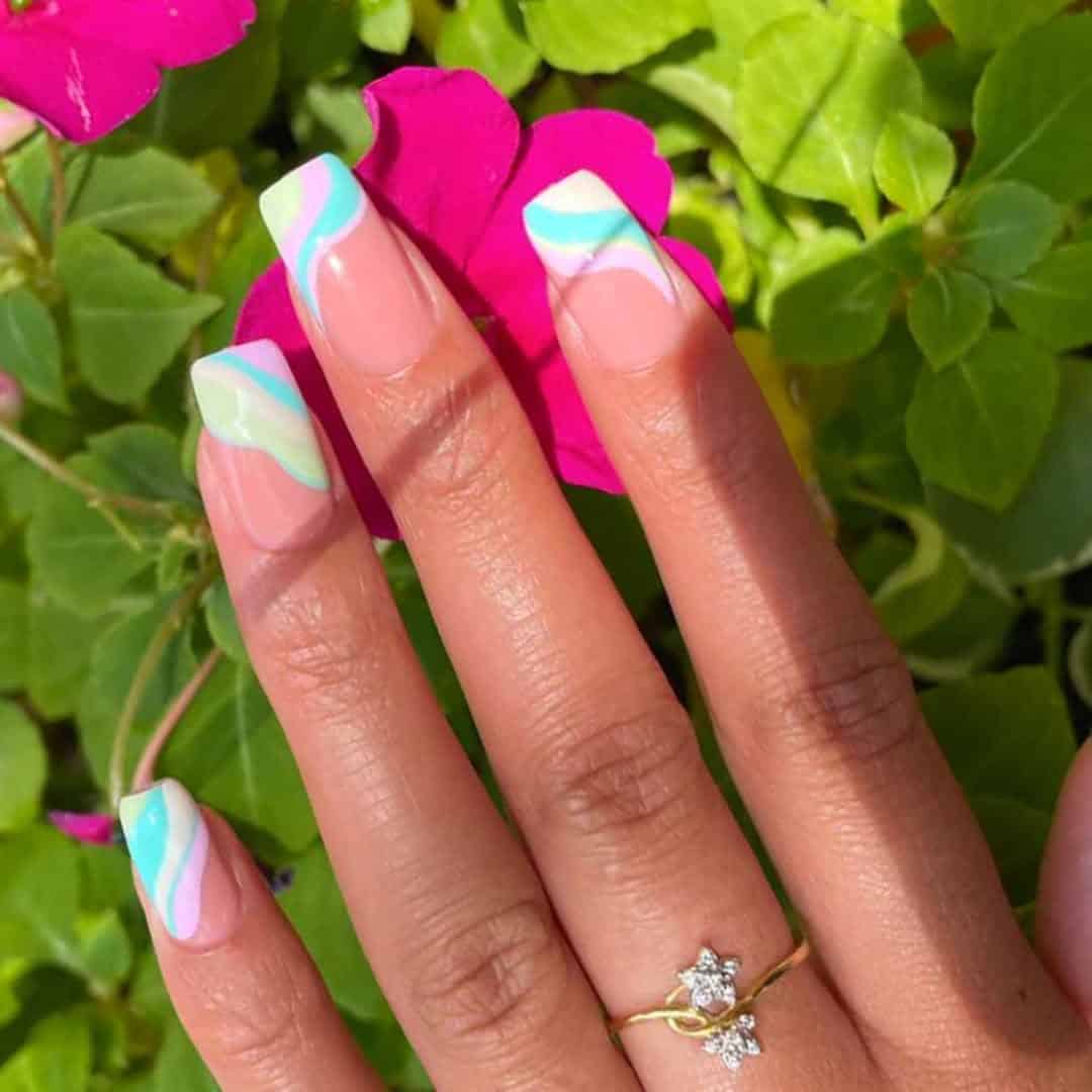 A soft and whimsical take on summer nails, this design features delicate pastel colors in rainbow gradient swirls. The smooth transitions between colors create a dreamy and elegant effect, perfect for those who love a subtle yet radiant manicure. If you’re aiming for a soft ombré or a more defined color blocked look, these nails offer a charming and versatile style for the season.