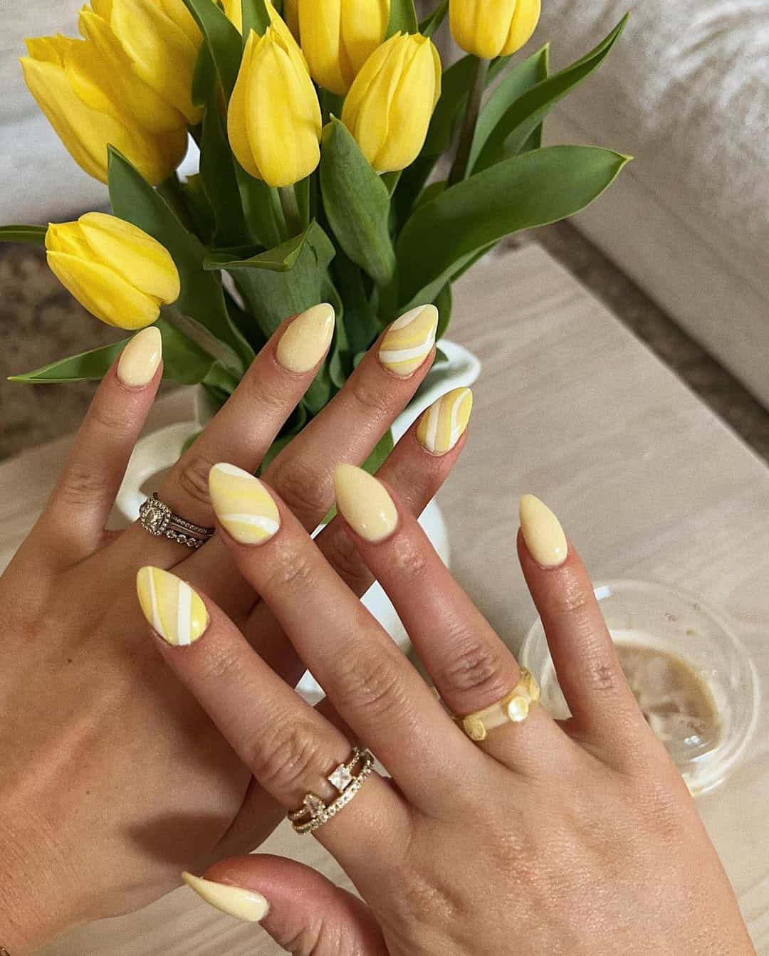 These bright and refreshing nails bring a summery twist with a soft yellow sorbet color. The playful white swirl design adds a fab contrast creating a look that’s both fun and sophisticated. Perfect for sunny days, this manicure is a great choice for those who love a fresh pop of color.