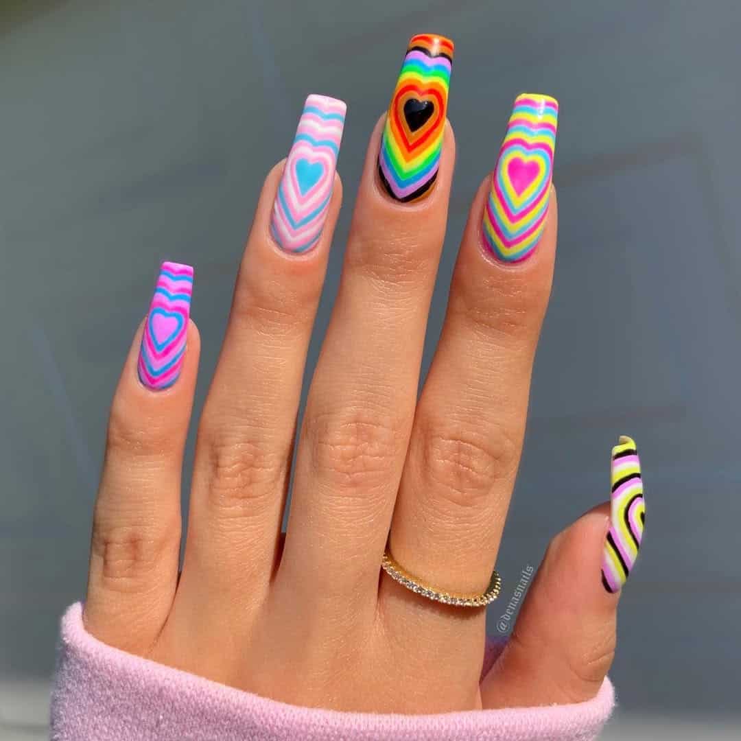 Celebrate self expression with these bold and dazzling pride themed coffin nails. Featuring a stunning mix of rainbow colors, this manicure is perfect for showing off your personality and embracing the spirit of inclusivity. Doesn’t matter if you opt for a glossy or matte finish, these colorful nails are a fun and stylish way to make a statement all summer long.
