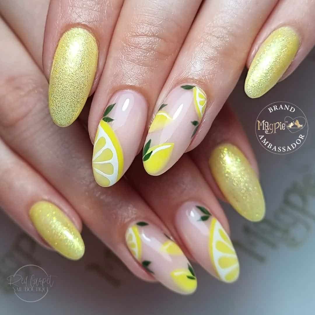 These citrus inspired almond nails bring a burst of summer freshness with a mix of solid glitter nails and playful lemon designs. The vibrant yellow shades paired with sparkling accents create a bold and lively look, perfect for warm weather outings. If you love a touch of shimmer or detailed fruit patterns, this manicure is a sweet and zesty choice for the season.