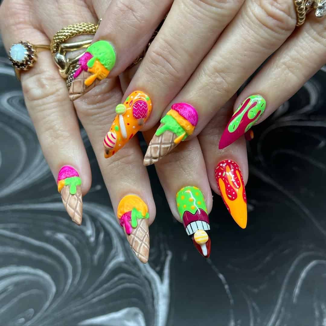 A playful and deliciously fun design, these bright and colorful 3D ice cream nails capture the sweet essence of summer. Featuring bright colourful cones, drips of melting ice cream, and tiny embellishments, this manicure is both whimsical and fabulous! Perfect for those who love a bold, statement making nail art design, these nails bring a touch of nostalgia and joy to any summer look.