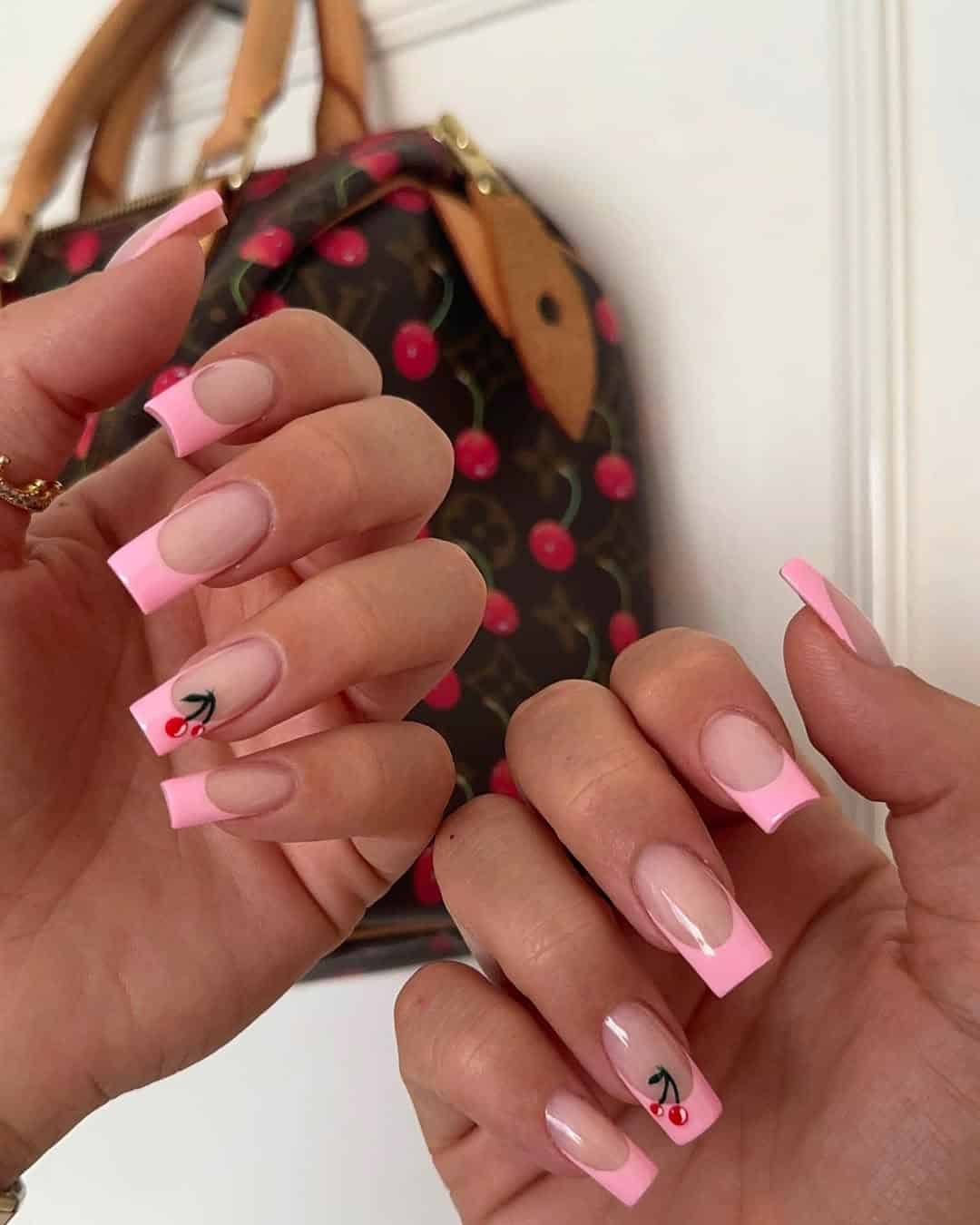 19. Pink French Tipped Coffin Nails With Cherry Accents