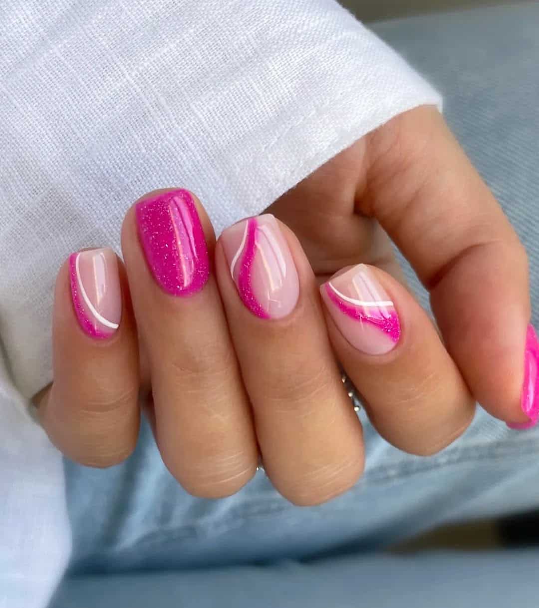 These sparkling neon pink nails are a bold summer statement, featuring dazzling glitter and sleek white swirls. The bold contrast between the electric pink and delicate swirling details adds a playful yet sophisticated touch. So if you’re headed to a beach party or just want to brighten up your look, this manicure is a fun and attention grabbing choice for the season.
