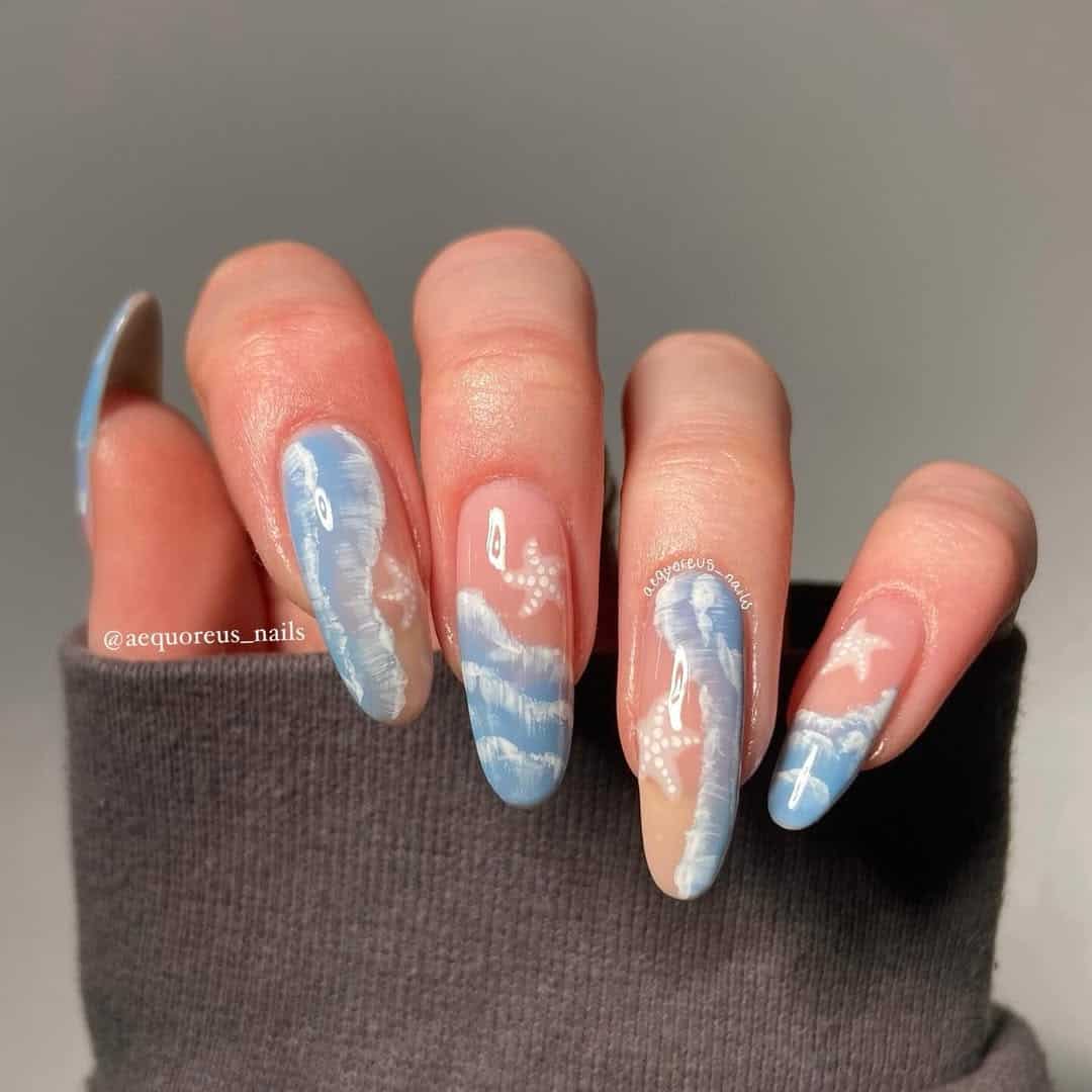 Channel the beauty of the ocean with these mesmerizing blue nails, reminiscent of crystal clear waters. Accented with delicate white starfish designs, this manicure brings a coastal charm that’s perfect for beach days and summer getaways. The combination of different shades of blues with intricate sea inspired details makes this a must have look for ocean lovers.
