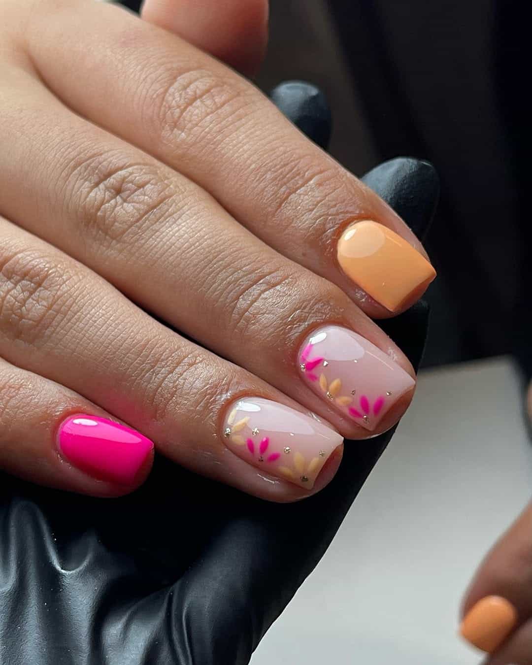 These soft apricot and pink nails offer a delicate and feminine touch, perfect for a subtle yet stylish summer manicure. The charming floral accents add a bit of elegance, making them ideal for both casual days and special occasions. With their short length and graceful design, these nails are just fab and easy to wear.