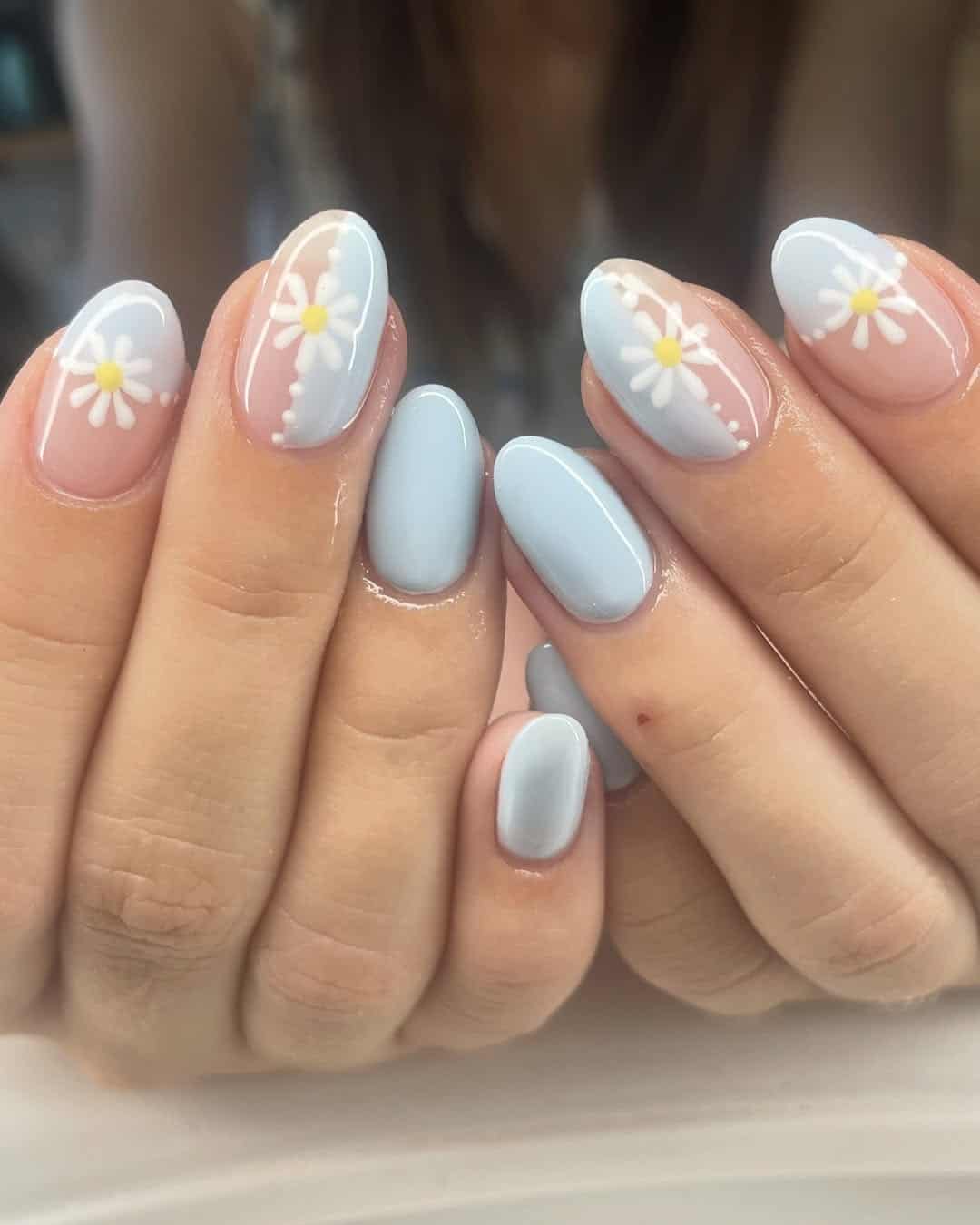 These nails capture the essence of summer with a beautiful half and half design featuring serene blue and crisp white hues. Delicate floral accents add a fresh, breezy touch, making them perfect for a chic yet playful manicure. Whether you’re strolling by the ocean or enjoying a sunny day out, this floral inspired design brings a beautiful elegance to your summer style.